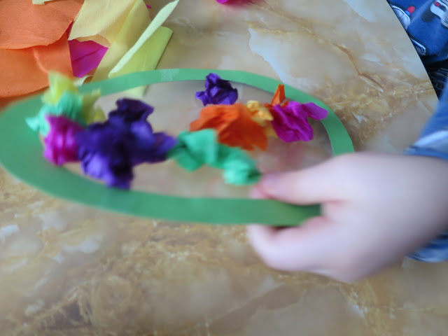 Tarvitset kartonkia, kontaktimuovia ja kreppipaperin tai silkkipaperin palasia tai mitä hyvänsä rypisteltävää paperia - tähän askarteluun voi hyödyntää jämäpapereitakin. Papereista leikataan palasia ja minä leikkasin aika ronskisti, koska palaset rypistellään ekä niiden tarvitse olla standardikokoisia. Tällainen askartelu onnistuu aivan varmasti sellaiseltakin tyypiltä, joka ei ole käsistään kovin taitava a.k.a. rähmäkäpälä.
